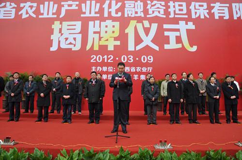 省政府、省財政廳、省金融辦、省農(nóng)業(yè)廳、銀行系統(tǒng)領(lǐng)導(dǎo)以及各市分管農(nóng)業(yè)產(chǎn)業(yè)化工作的負(fù)責(zé)人;陜西省農(nóng)業(yè)產(chǎn)業(yè)化國家級龍頭企業(yè)負(fù)責(zé)人;陜西省農(nóng)業(yè)產(chǎn)業(yè)化龍頭企業(yè)協(xié)會理事單位負(fù)責(zé)同志一起見證了陜西省農(nóng)業(yè)產(chǎn)業(yè)化融資擔(dān)保公司成立揭牌的隆重時刻。