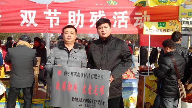 為表達(dá)石羊“邦淇人”對武功2.8萬殘疾人的關(guān)愛之情,元月1日到3日,邦淇小包總公司聯(lián)合武功縣殘疾人聯(lián)合會、陜通配送中心在縣中心廣場聯(lián)合舉辦“扶弱助殘獻(xiàn)愛心、饋贈武功眾鄉(xiāng)親”活動,此次活動得到了油脂事業(yè)部王曉勇副總經(jīng)理的大力支持,公司提供邦淇1.8L一豆300余桶、價(jià)值5000元,現(xiàn)場給重度殘疾人代表免費(fèi)發(fā)放。武功殘聯(lián)理事長秦喜、邦淇小包西區(qū)總經(jīng)理張帆、陜通配送中心經(jīng)理何凱及市場部有關(guān)人員共同參加。張總代表公司發(fā)表了熱情洋溢致辭,他首先感謝武功父老長期對“邦淇”的支持,然后簡要介紹了集團(tuán)及油脂產(chǎn)業(yè)的基本情況,最后表達(dá)了對武功殘疾人朋友的深切關(guān)愛,博得了現(xiàn)場群眾的由衷稱贊。在熱烈的掌聲中,殘聯(lián)領(lǐng)導(dǎo)將一面寫有“扶弱助殘、大愛無垠”的銅牌授予邦淇公司。