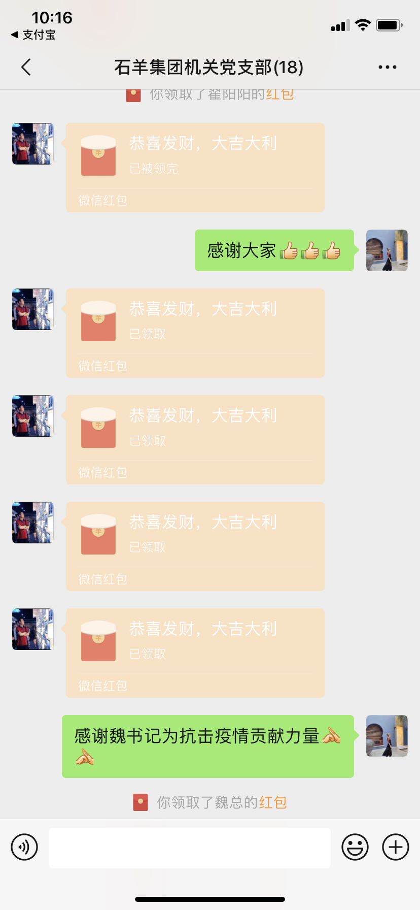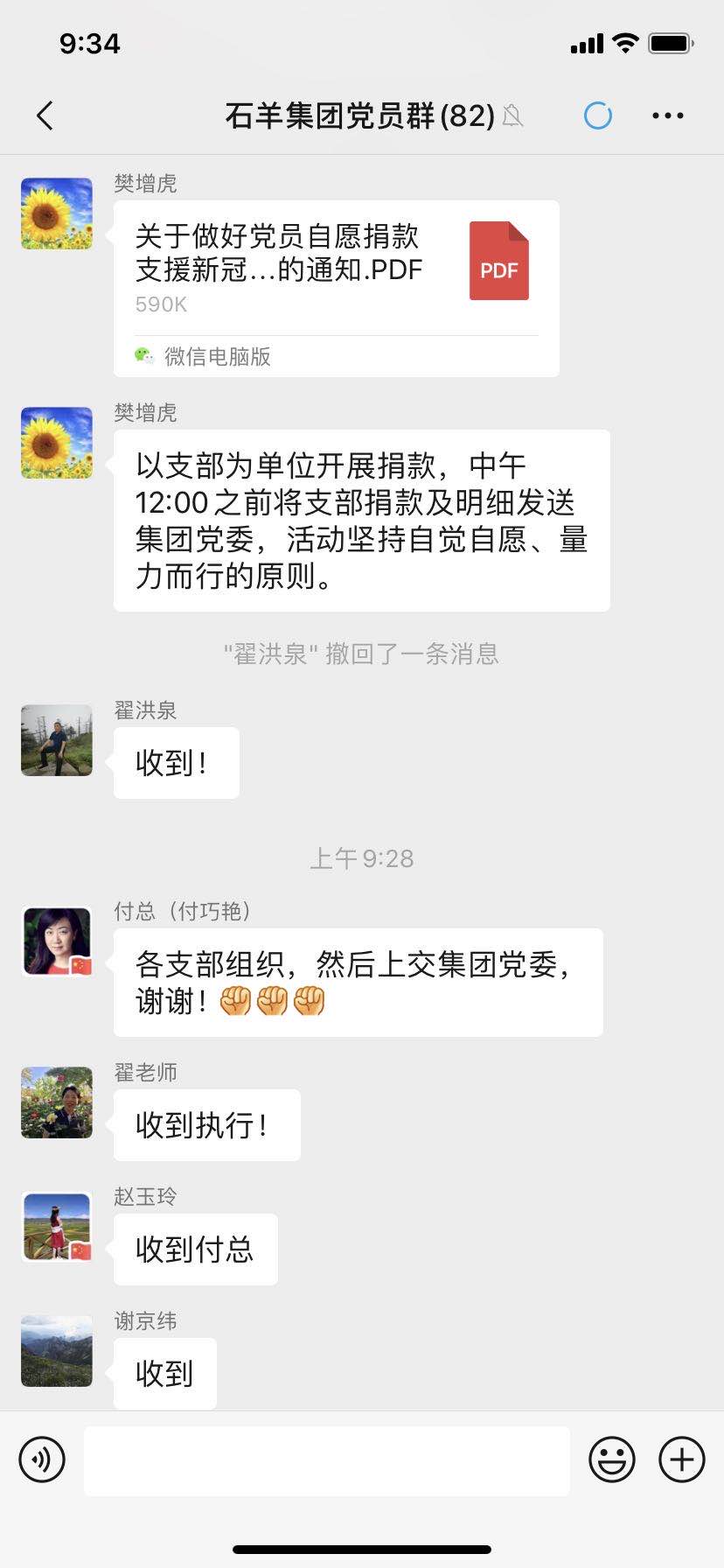 疫情就是命令,防控就是責任。危難時刻,共產(chǎn)黨員就應該沖鋒在前。2月28日上午,石羊集團黨委下發(fā)《關于做好黨員自愿捐款支援新冠疫情防控工作的通知》,通知發(fā)出后,全體黨員和入黨積極分子踴躍響應,積極行動自愿繳納這份“特殊黨費”,為疫情防控貢獻力量,踐行石羊愛心和擔當。